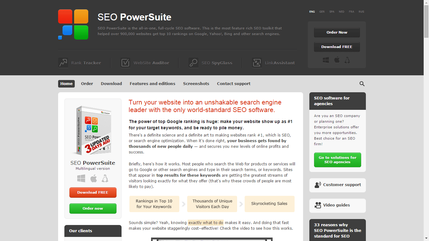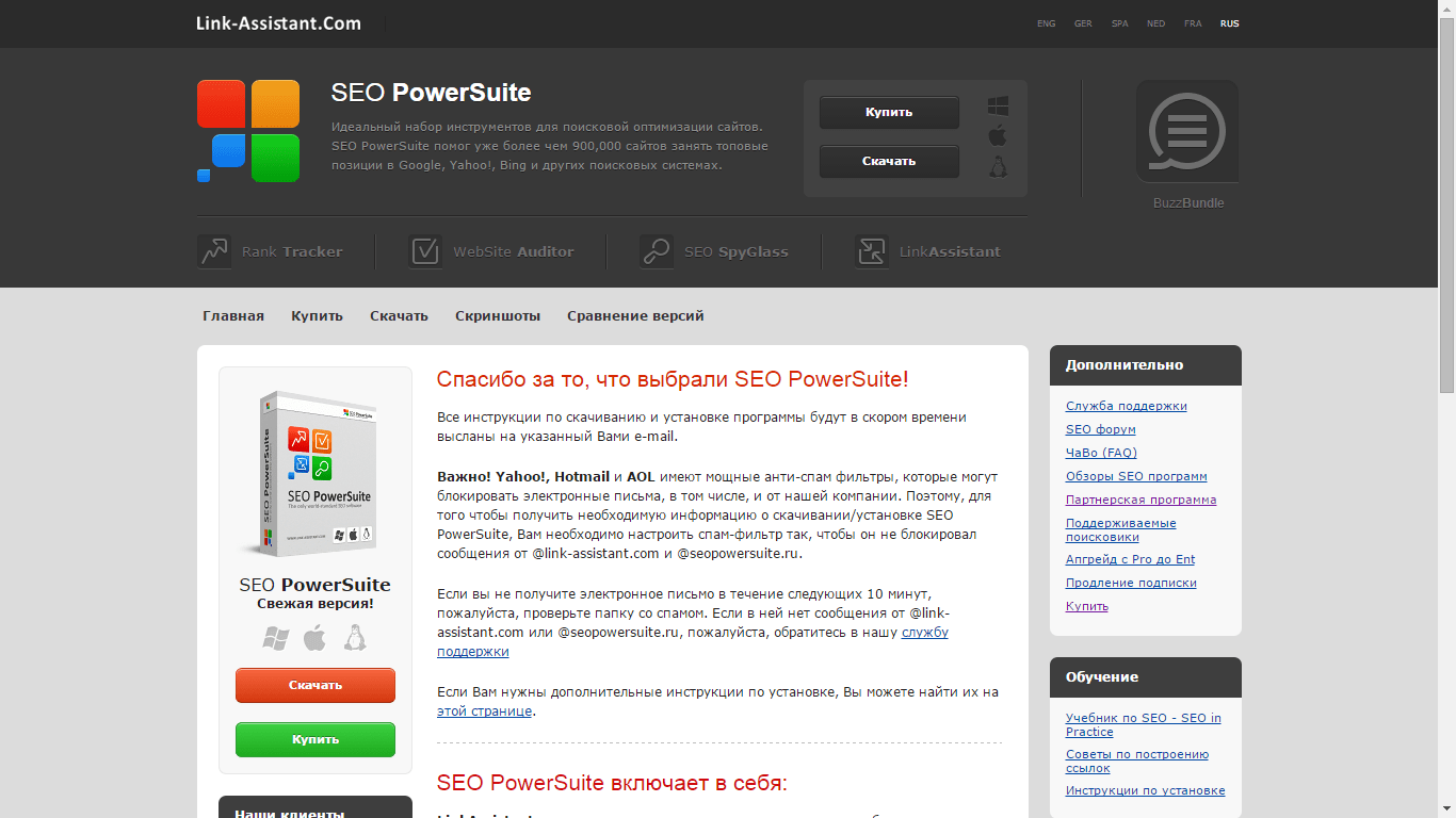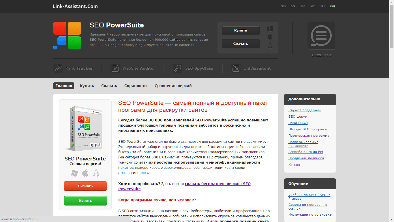 Наткнулся на интересный пакет программ для SEO продвижения SEO PowerSuite. Набор состоит из нескольких программ: Rank Tracker, WebSite Auditor, SEO SpyGlass и LinkAssistant. Но начинаем по-порядку — заходим на сайт PowerSuite и выбираем русский язык.