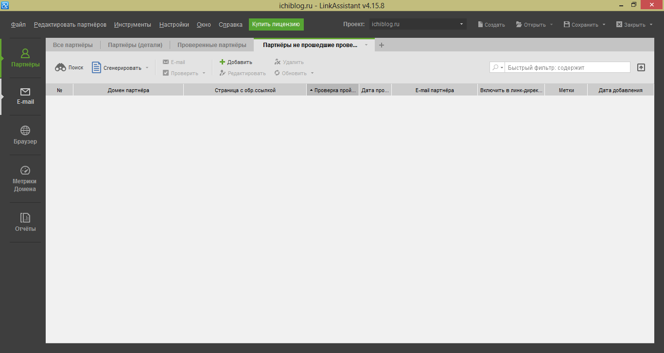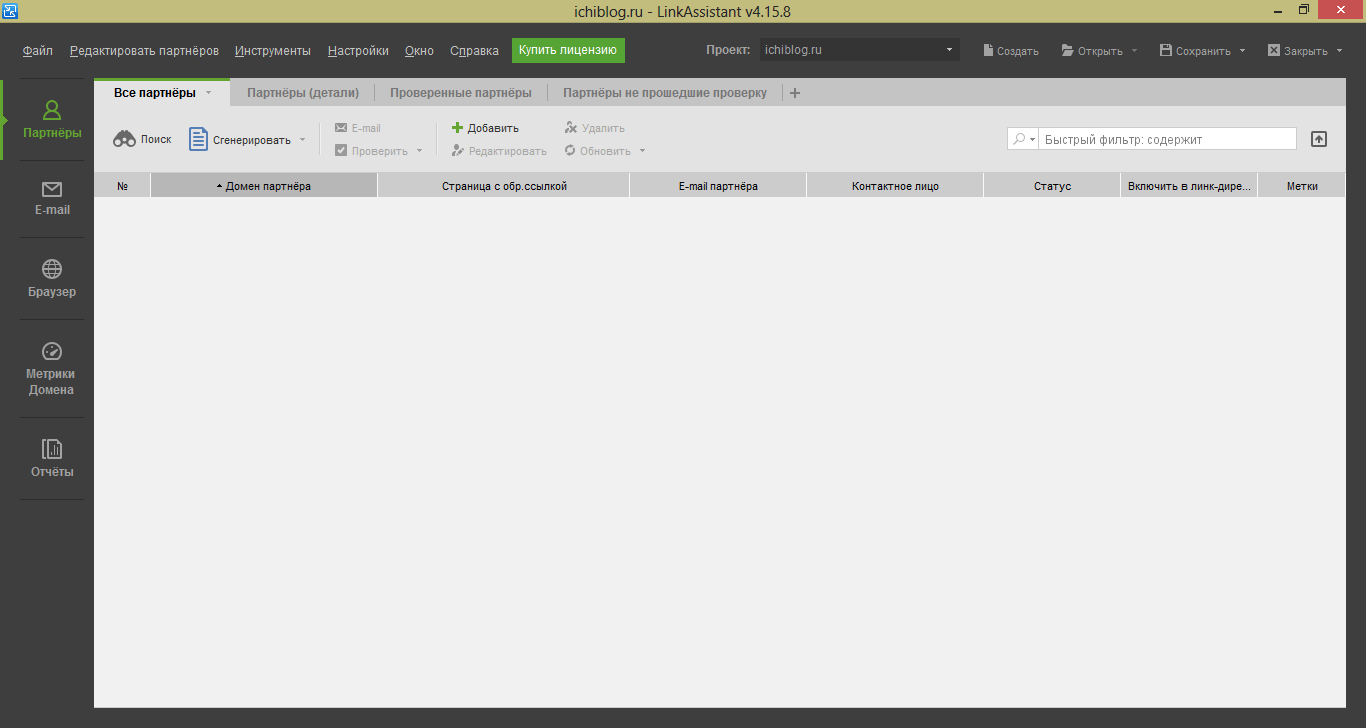 Управление обменом ссылок и проверка их наличия и валидности. Можно подключить Google Analytics для отображения посещений. Программа работает просто, выбираешь куда сохранить шаблон для формы обмена ссылками и меняешься с другими сайтами. Бесплатная версия не позволяет сохранять проекты.