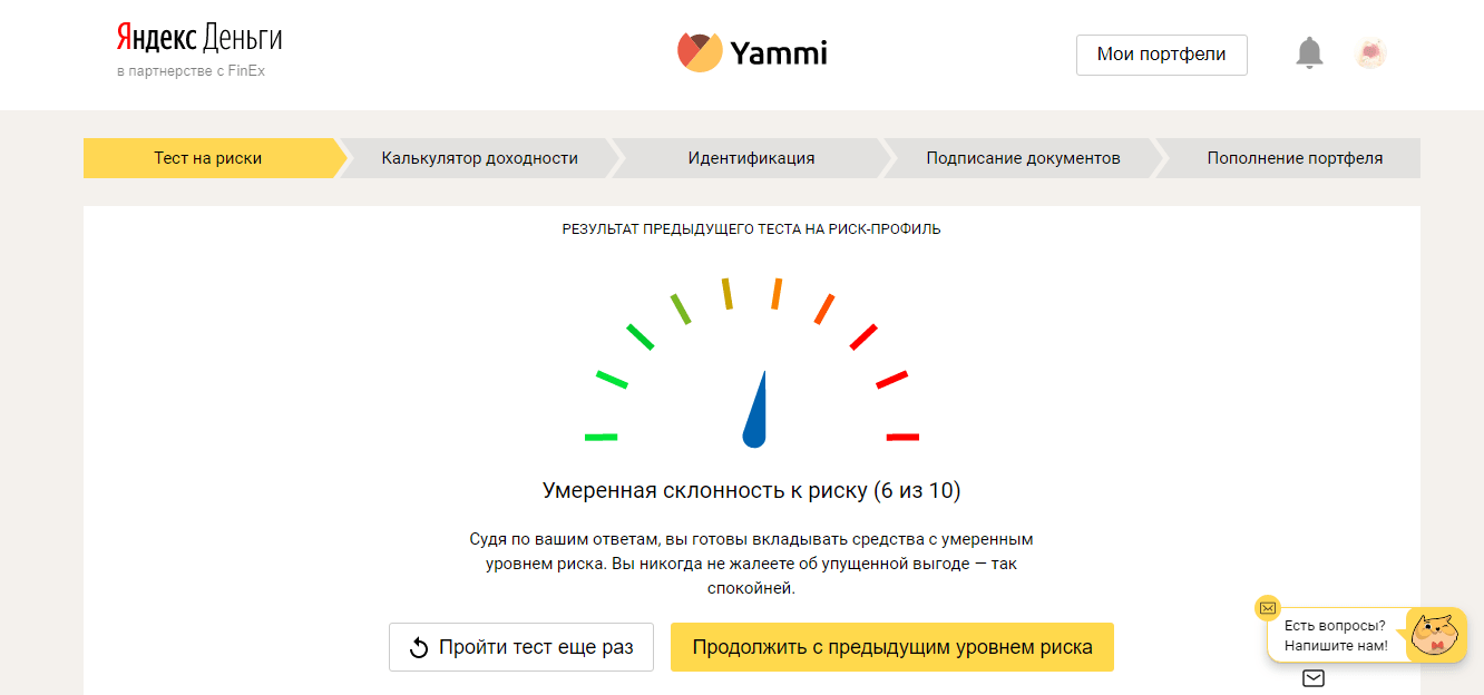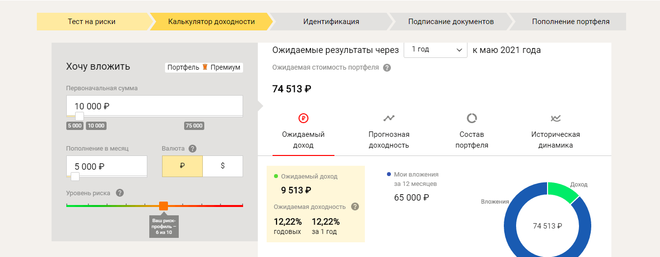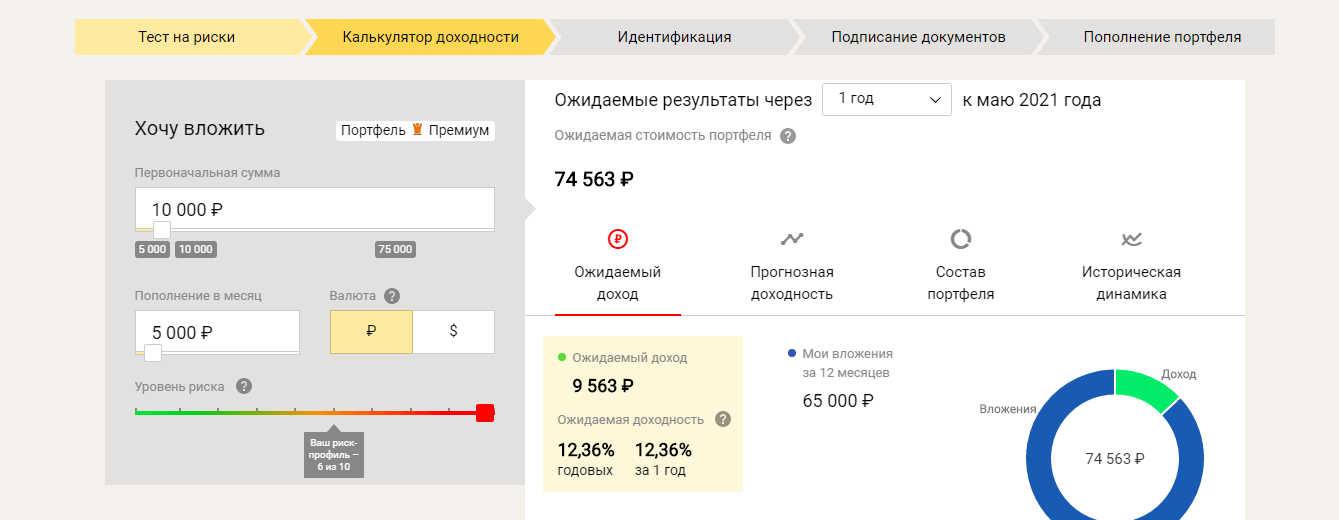 После входа нам предлагают создать портфель, где доходность будет до 27% годовых. Для этого надо пройти тест на риски. Потом выбираем срок инвестиции и подбираем благоприятный план вложений — начальную сумму и ежемесячные платежи.