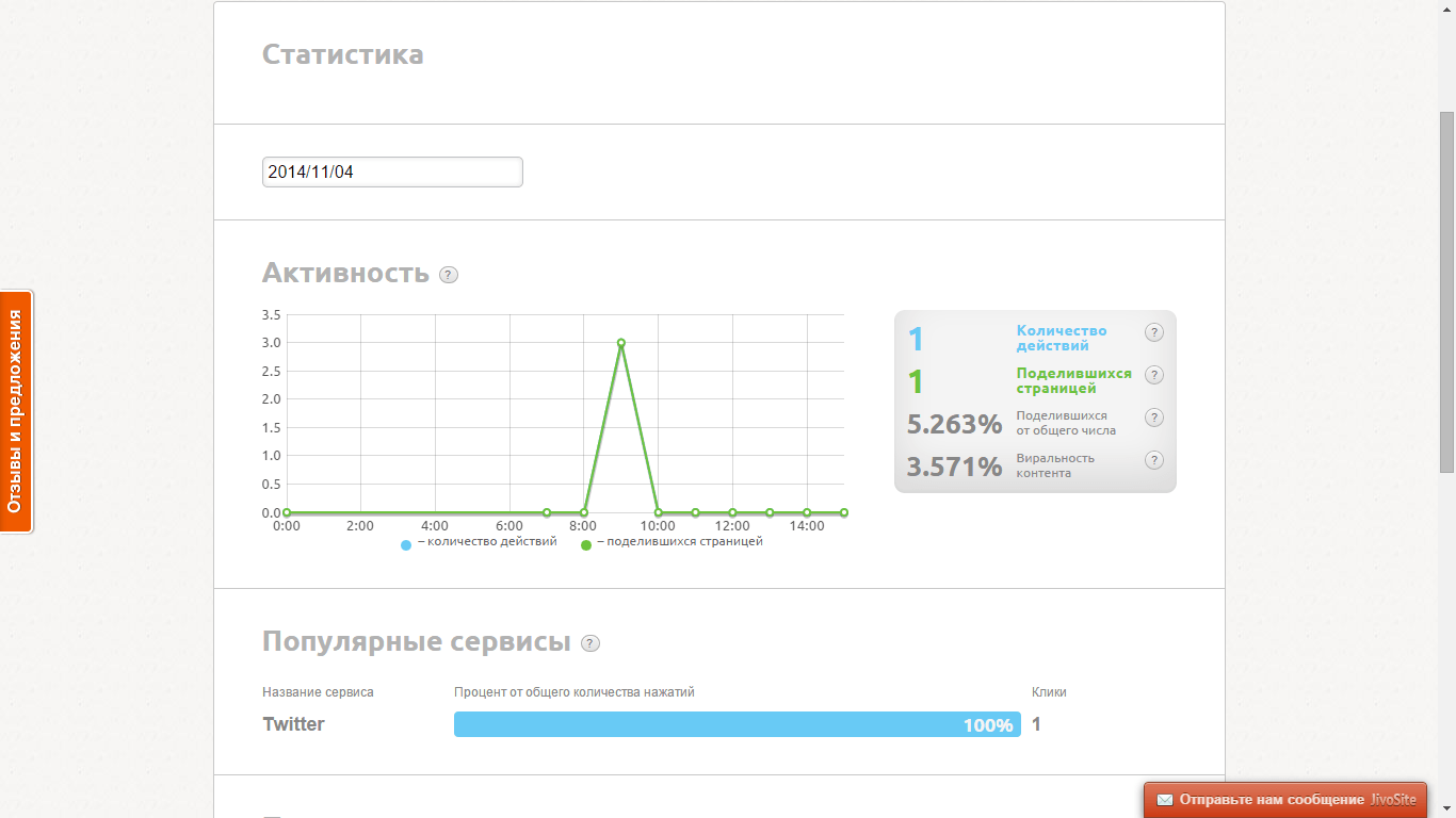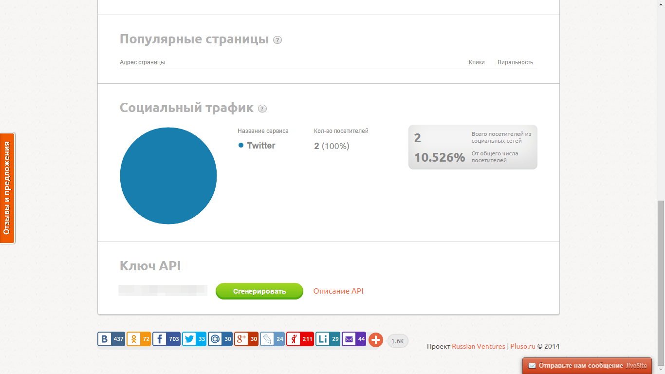 Вот тут и начинаются проблемы. Нажатия на кнопки обрабатываются скриптом на сайте pluso. Когда кто-то нажимает, срабатывает скрипт и счетчик увеличивается на один, даже если посетитель нажал потом «отмена». На сайте выводится статистика с ошибками, что видно по скриншотам, где нажата один раз кнопка твиттера. Также нет группировки по сайтам — выводится только общая статистика.