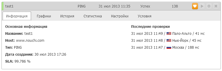 - «Информация» (название, хост, тип, дата создания, SLA, сведения о последних проверках);