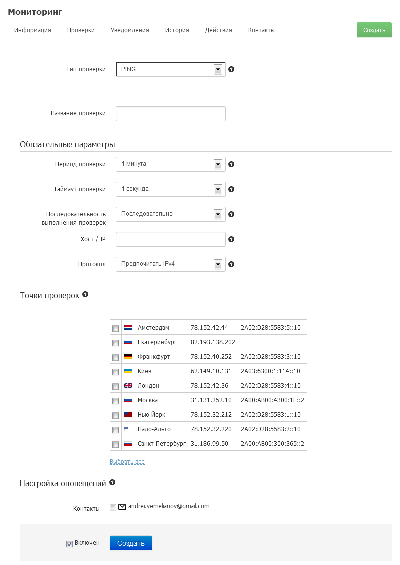 Проверки могут быть сделаны из городов: Москва, Санкт-Петербург, Екатеринбург, Киев, Амстердам, Франкфурт, Лондон, Нью-Йорк, Пало-Альто. Если на вашем сервере установлен фаервол, то при создании проверки вы можете получить IP-адреса точек присутствия, чтобы включить их в правила фаервола.