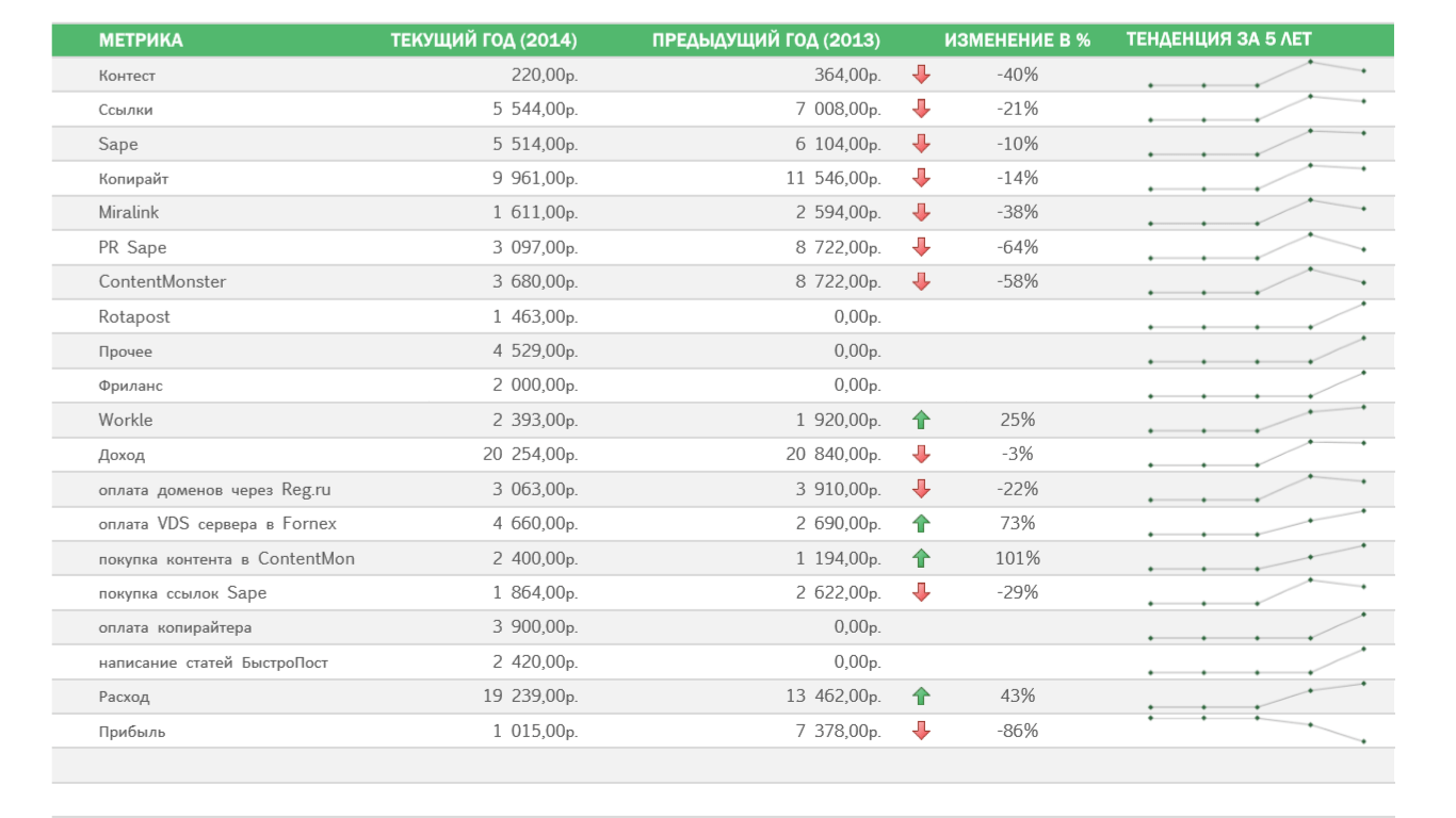 Прибыль 1 015,00р. В прошлом годы прибыль была 7 378,00р. (-86%). Но это из-за увеличенных расходов — покупка статей.
