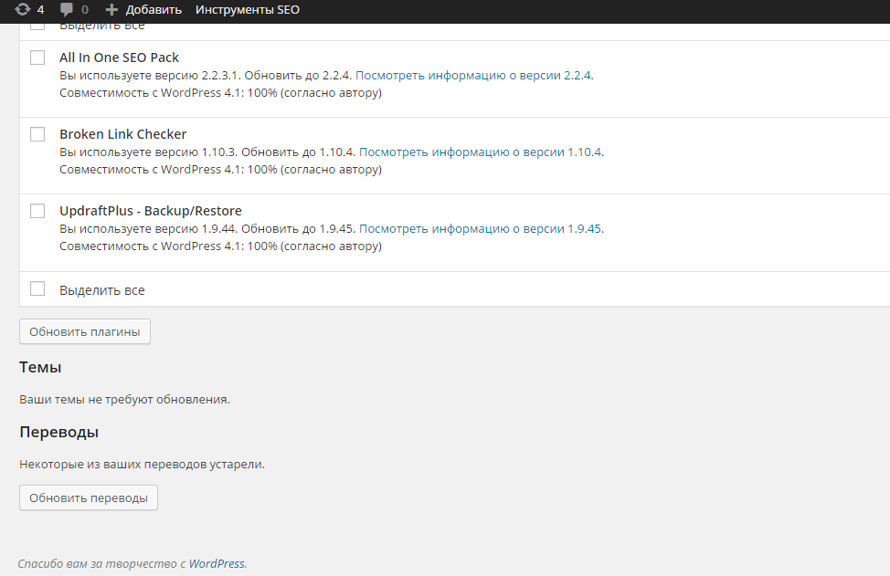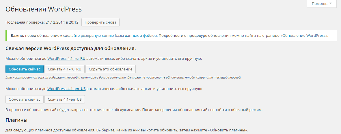 Делаем резервные копии базы данных и сайта. Заходим в раздел обновления и нажимаем обновить сейчас.