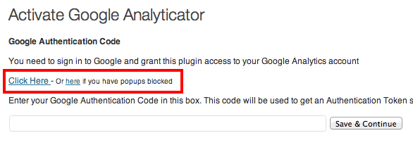 Первый шаг — это авторизация в Google (чтобы предоставить плагину доступ к вашей статистике посещаемости), и с этой задачей Google Analyticator справляется легко и просто. Убедитесь, что вы зашли в учетную запись Google — и нажмите на «Click Here».