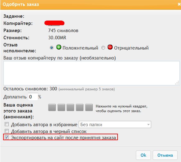 При принятии заказа выберите пункт «Экспортировать на сайт после принятия заказа». После принятия заказа пост будет автоматически экспортирован на ваш блог с настройками, указанными при создании заказа.