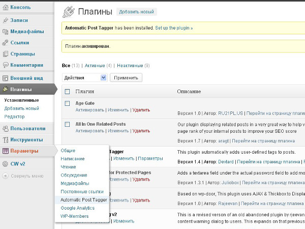 Не будем рассматривать установку плагина. Об этом я писал уже неоднократно. После установки и активации плагина появится дополнительное меню в настройках.