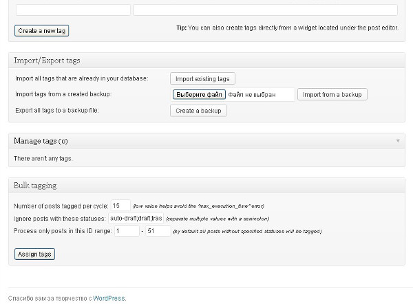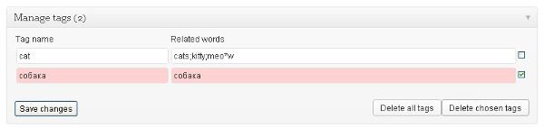 Ставим галочку напротив нужной позиции и нажимаем кнопку «Delete chosen tags». Главное не перепутать с кнопкой «Delete all tags», которая удалит все теги. Как видно в примере, искомые слова могут содержать маску.